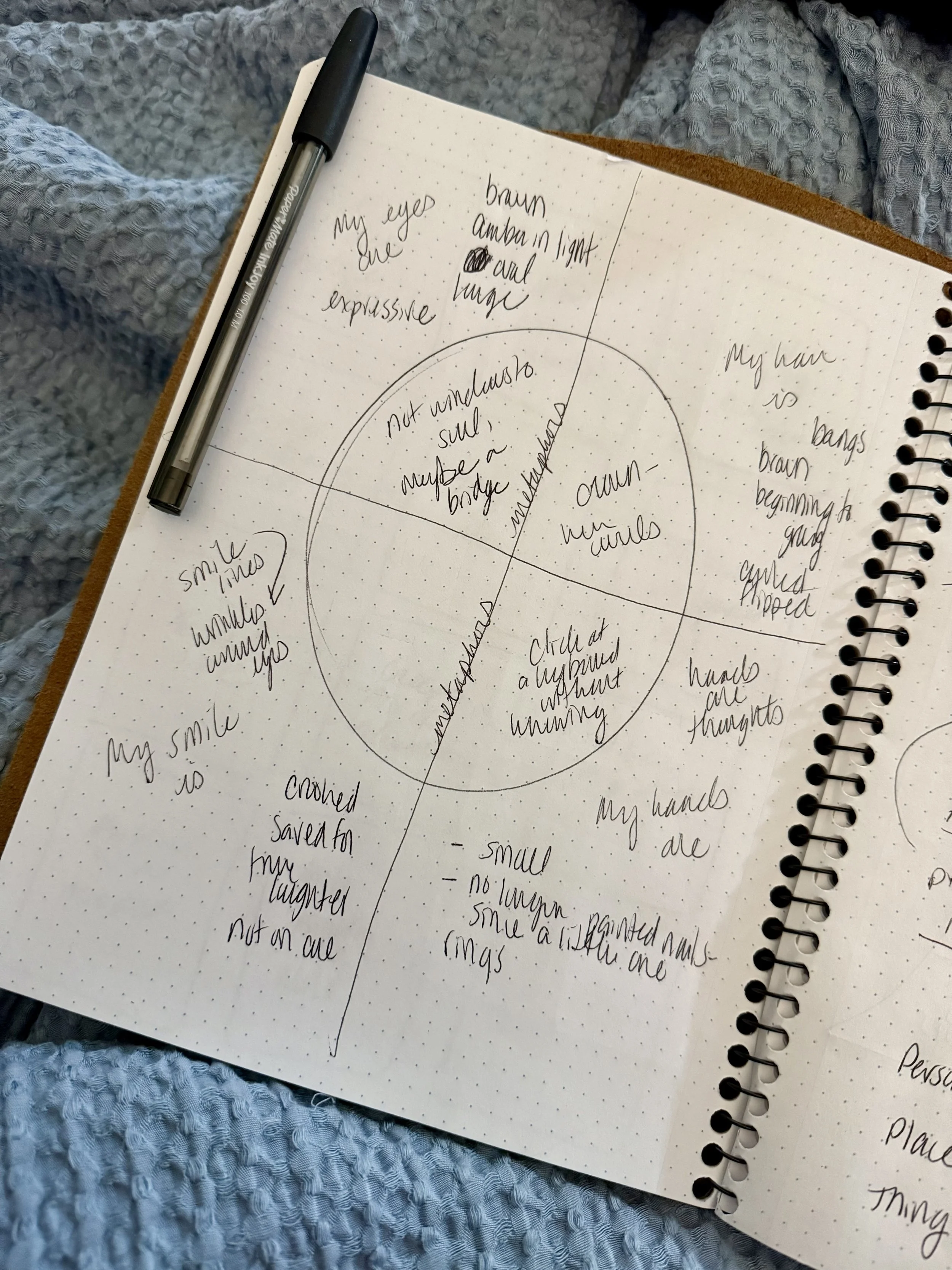 When I tried this with my own writing, I set up a circle map and divided it into four sections. You could choose any part of the face or body, but I focused on the eyes, smile, hands, and hair. After pairing this activity with Jessica Urlichs’ poem “Finding Me in You” and the Emily Dickinson quote, “I am out with lanterns, looking for myself,” here are some of my favorite lines from my notebook: